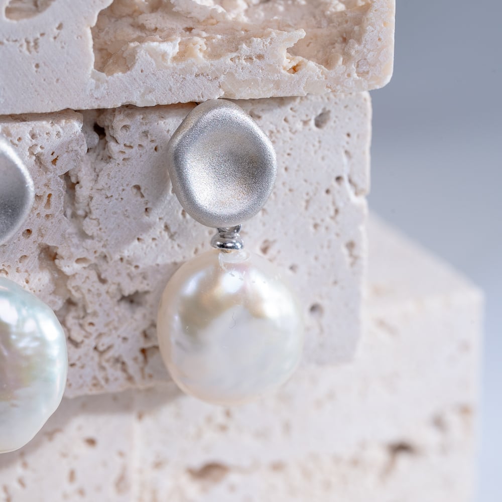 淡水パールとマットなシルバープレートを組み合わせたピアス。